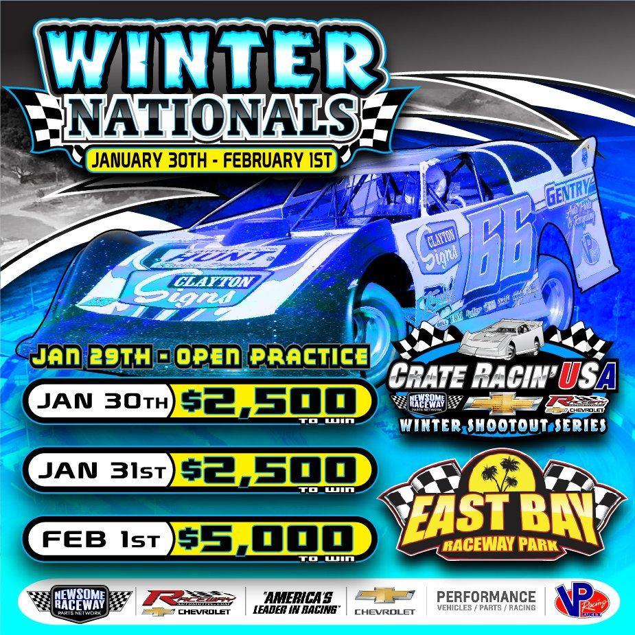 The Newsome Raceway Parts Crate Racin' USA Winter Shootout Series will heads to the "Clay by the Bay", East Bay Raceway Park for the 44th Annual running of the East Bay Winter Nationals.