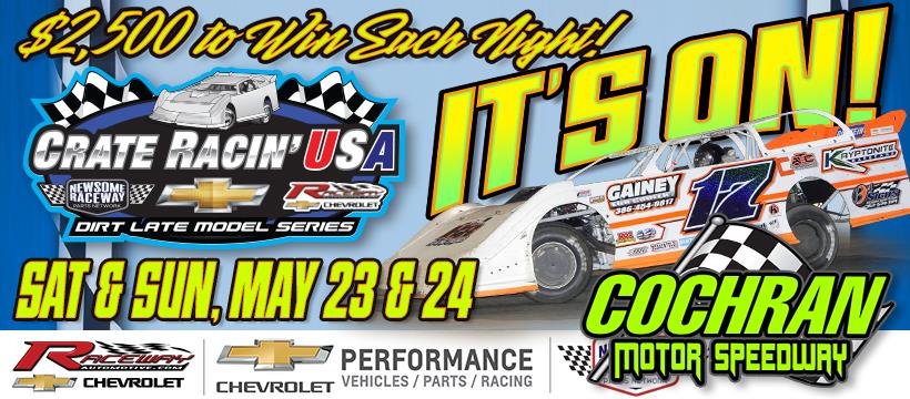 ADAIRSVILLE, GA – The Newsome Raceway Parts Crate Racin’ USA Dirt Late Model Series will open its 2020 National Tour with a pair of $2,500-to-win 50-lap races on Saturday, May 23 and Sunday, May 24 at Cochran Motor Speedway in Cochran, GA. Current COVID 19 protocol will require special limitations for the races.