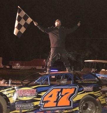 PHOTO CUTLINE: Shannon Lee of Lumberton, MS dances on the roof of his #47 Billy Riels Racing Special to celebrate clinching his second straight $10,000 Newsome Raceway Parts Crate Racin’ USA Weekly Racing Series Late Model National Championship on Saturday night at Pike County Speedway in McComb, MS. Lee won the Week 19 Make-Up race and the Week 20 Race to capture his 13th and 14th 50-point win of the 2020 season to seal the deal. (Sandy Lee Photo)
