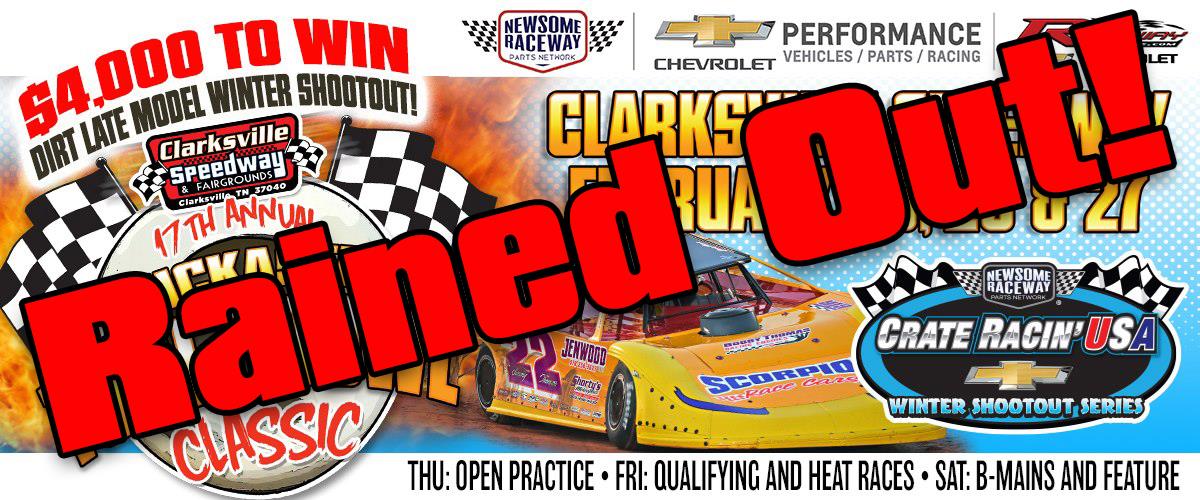 ADAIRSVILLE, Ga. (Feb. 24) — A dismal weather forecast combined with currently wet grounds at Clarksville (Tenn.) Speedway has forced postponement of the 17th annual Tuckassee Toilet Bowl Classic weekend scheduled Feb. 25-27 at the 3/8-mile oval, which was scheduled to include a $4,000-to-win show for the Adairsville, Ga-based Crate Racin’ USA Winter Shootout Series.