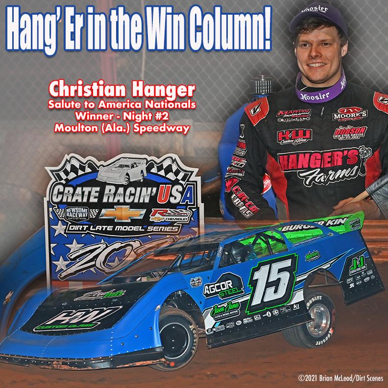 DANVILLE, Ala. (July 2) — Christian Hanger has been mostly absent from the Newsome Raceway Parts-sponsored Crate Racin’ USA Dirt Late Model Series this season while competing in the Super Late Model ranks, but he didn’t forget how to drive a race car powered by a 604 Chevrolet Performance Circle Track Engine and wheeled a 7-year-old MasterSbilt-chassied entry to a flag-to-flag victory in a 40-lap event Friday night during the annual Salute to America Nationals at Moulton Speedway.