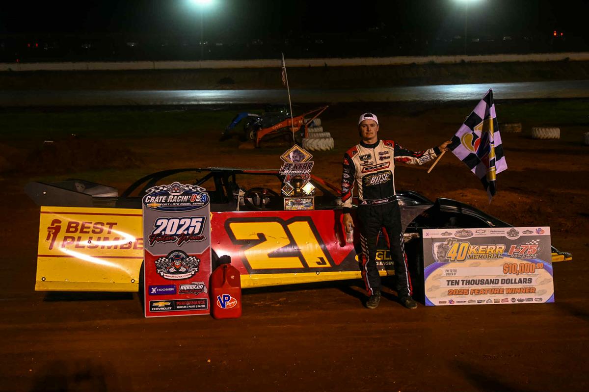 (Sweetwater, TN – June 21, 2025) – East Tennessee’s own Cory Hedgecock continued to etch his name in Crate Racin’ USA history Saturday night, claiming his sixth career JT Kerr Memorial victory in dominant fashion at I-75 Raceway. Hedgecock used an early-race pass and flawless navigation through lapped traffic to lead 56 of the 60 laps and earn the $10,000 payday in front of a hometown crowd.